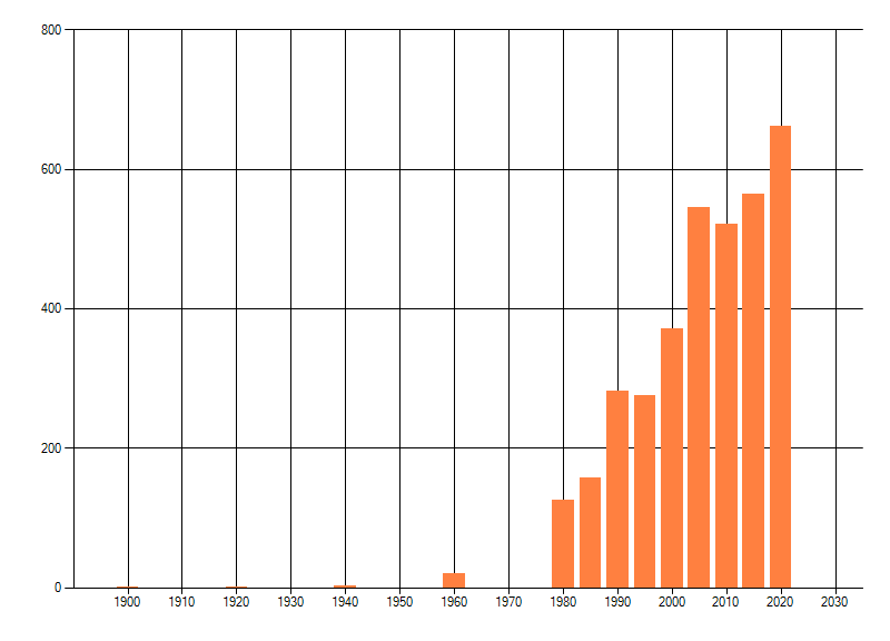 Het aantal atlasblokken (5x5 km) waarin de soort is gemeld binnen een periode van vijf jaar (vanaf 1980) of twintig jaar. Niet gecorrigeerd voor waarnemersinspanning en het aantal doorgegeven waarnemingen kan sterk variëren per periode, dus een trend in verspreiding kan hier niet direct uit worden afgelezen. Het opgegeven jaartal is het eerste jaar van de periode. Bron: gevalideerde waarnemingen uit de NDFF.