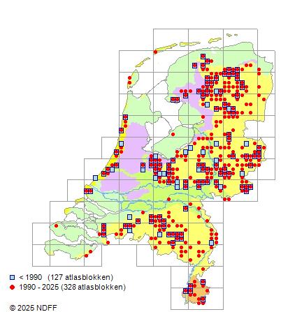 Het aantal atlasblokken (5x5 km) waarin de soort is gemeld binnen een periode van vijf jaar (vanaf 1980) of twintig jaar. Niet gecorrigeerd voor waarnemersinspanning en het aantal doorgegeven waarnemingen kan sterk variëren per periode, dus een trend in verspreiding kan hier niet direct uit worden afgelezen. Het opgegeven jaartal is het eerste jaar van de periode. Bron: gevalideerde waarnemingen uit de NDFF.