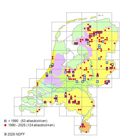 Het aantal atlasblokken (5x5 km) waarin de soort is gemeld binnen een periode van vijf jaar (vanaf 1980) of twintig jaar. Niet gecorrigeerd voor waarnemersinspanning en het aantal doorgegeven waarnemingen kan sterk variëren per periode, dus een trend in verspreiding kan hier niet direct uit worden afgelezen. Het opgegeven jaartal is het eerste jaar van de periode. Bron: gevalideerde waarnemingen uit de NDFF.