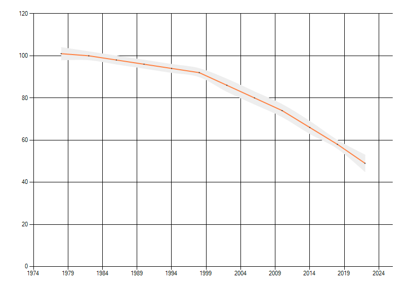 Gemiddelde trend van het aantal kilometerhokken waarin de soort voorkomt, weergegeven als indexcijfer (1975-1978 = 100).