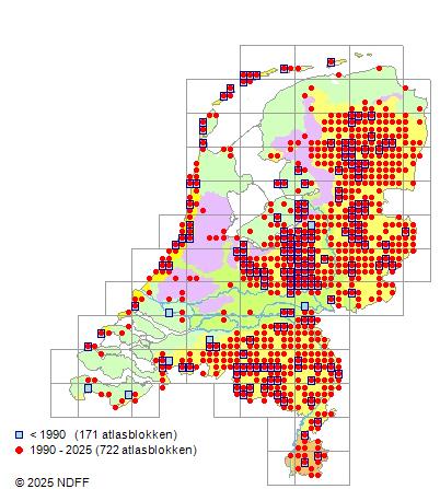 Het aantal atlasblokken (5x5 km) waarin de soort is gemeld binnen een periode van vijf jaar (vanaf 1980) of twintig jaar. Niet gecorrigeerd voor waarnemersinspanning en het aantal doorgegeven waarnemingen kan sterk variëren per periode, dus een trend in verspreiding kan hier niet direct uit worden afgelezen. Het opgegeven jaartal is het eerste jaar van de periode. Bron: gevalideerde waarnemingen uit de NDFF.