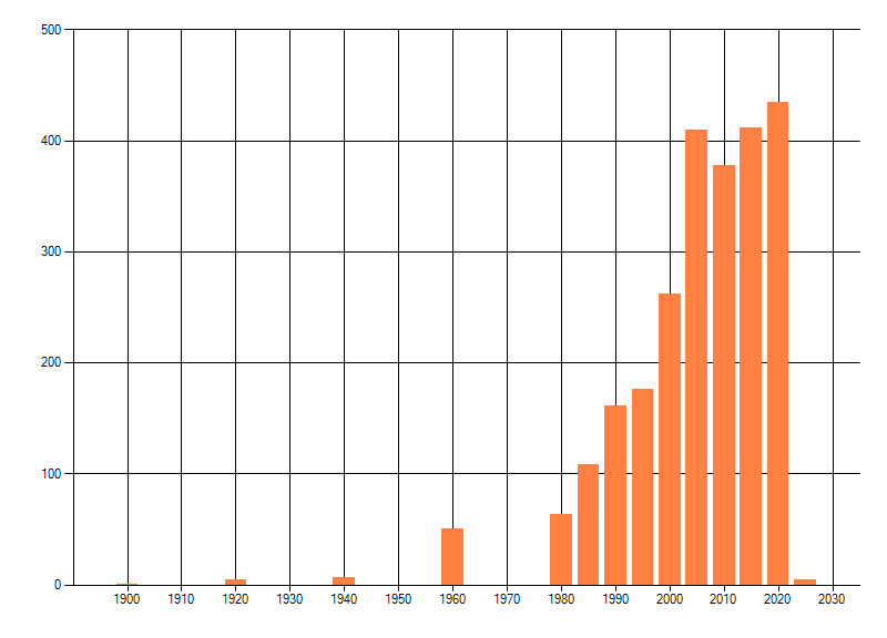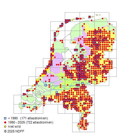 Het aantal atlasblokken (5x5 km) waarin de soort is gemeld binnen een periode van vijf jaar (vanaf 1980) of twintig jaar. Niet gecorrigeerd voor waarnemersinspanning en het aantal doorgegeven waarnemingen kan sterk variëren per periode, dus een trend in verspreiding kan hier niet direct uit worden afgelezen. Het opgegeven jaartal is het eerste jaar van de periode. Bron: gevalideerde waarnemingen uit de NDFF.