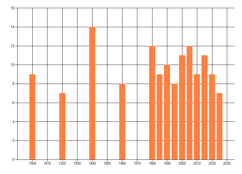 Het aantal atlasblokken (5x5 km) waarin de soort is gemeld binnen een periode van vijf jaar (vanaf 1980) of twintig jaar. Niet gecorrigeerd voor waarnemersinspanning en het aantal doorgegeven waarnemingen kan sterk variëren per periode, dus een trend in verspreiding kan hier niet direct uit worden afgelezen. Het opgegeven jaartal is het eerste jaar van de periode. Bron: gevalideerde waarnemingen uit de NDFF.