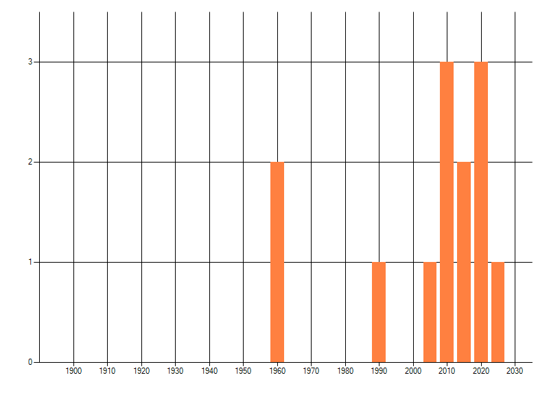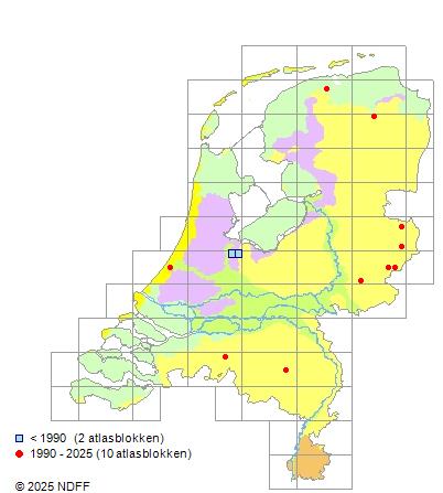 Het aantal atlasblokken (5x5 km) waarin de soort is gemeld binnen een periode van vijf jaar (vanaf 1980) of twintig jaar. Niet gecorrigeerd voor waarnemersinspanning en het aantal doorgegeven waarnemingen kan sterk variëren per periode, dus een trend in verspreiding kan hier niet direct uit worden afgelezen. Het opgegeven jaartal is het eerste jaar van de periode. Bron: gevalideerde waarnemingen uit de NDFF.