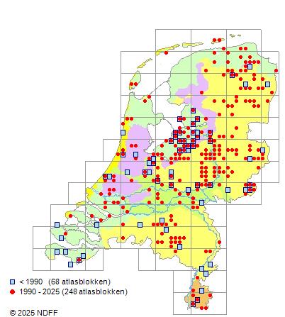 Het aantal atlasblokken (5x5 km) waarin de soort is gemeld binnen een periode van vijf jaar (vanaf 1980) of twintig jaar. Niet gecorrigeerd voor waarnemersinspanning en het aantal doorgegeven waarnemingen kan sterk variëren per periode, dus een trend in verspreiding kan hier niet direct uit worden afgelezen. Het opgegeven jaartal is het eerste jaar van de periode. Bron: gevalideerde waarnemingen uit de NDFF.