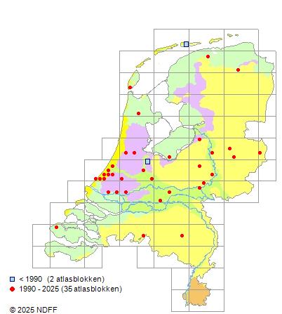 Het aantal atlasblokken (5x5 km) waarin de soort is gemeld binnen een periode van vijf jaar (vanaf 1980) of twintig jaar. Niet gecorrigeerd voor waarnemersinspanning en het aantal doorgegeven waarnemingen kan sterk variëren per periode, dus een trend in verspreiding kan hier niet direct uit worden afgelezen. Het opgegeven jaartal is het eerste jaar van de periode. Bron: gevalideerde waarnemingen uit de NDFF.