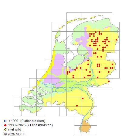 Het aantal atlasblokken (5x5 km) waarin de soort is gemeld binnen een periode van vijf jaar (vanaf 1980) of twintig jaar. Niet gecorrigeerd voor waarnemersinspanning en het aantal doorgegeven waarnemingen kan sterk variëren per periode, dus een trend in verspreiding kan hier niet direct uit worden afgelezen. Het opgegeven jaartal is het eerste jaar van de periode. Bron: gevalideerde waarnemingen uit de NDFF.