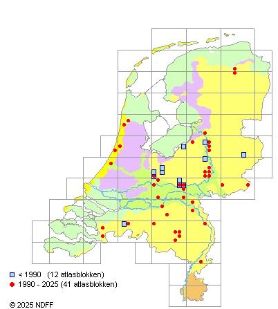 Het aantal atlasblokken (5x5 km) waarin de soort is gemeld binnen een periode van vijf jaar (vanaf 1980) of twintig jaar. Niet gecorrigeerd voor waarnemersinspanning en het aantal doorgegeven waarnemingen kan sterk variëren per periode, dus een trend in verspreiding kan hier niet direct uit worden afgelezen. Het opgegeven jaartal is het eerste jaar van de periode. Bron: gevalideerde waarnemingen uit de NDFF.