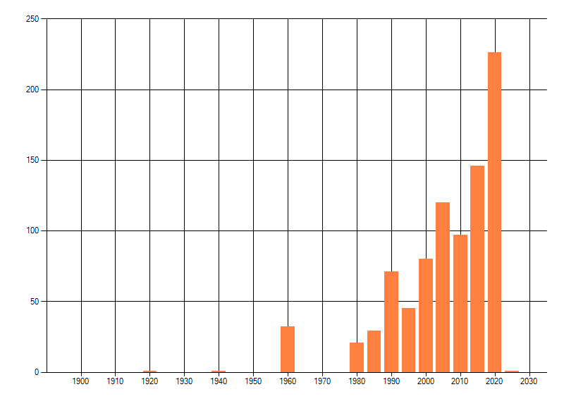 Het aantal atlasblokken (5x5 km) waarin de soort is gemeld binnen een periode van vijf jaar (vanaf 1980) of twintig jaar. Niet gecorrigeerd voor waarnemersinspanning en het aantal doorgegeven waarnemingen kan sterk variëren per periode, dus een trend in verspreiding kan hier niet direct uit worden afgelezen. Het opgegeven jaartal is het eerste jaar van de periode. Bron: gevalideerde waarnemingen uit de NDFF.