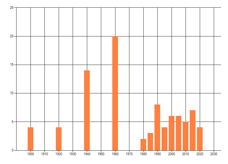 Het aantal atlasblokken (5x5 km) waarin de soort is gemeld binnen een periode van vijf jaar (vanaf 1980) of twintig jaar. Niet gecorrigeerd voor waarnemersinspanning en het aantal doorgegeven waarnemingen kan sterk variëren per periode, dus een trend in verspreiding kan hier niet direct uit worden afgelezen. Het opgegeven jaartal is het eerste jaar van de periode. Bron: gevalideerde waarnemingen uit de NDFF.