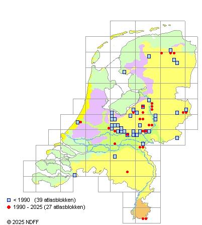Vroeger vrij zeld., thans zeld. tot zeer zeld.; voornamelijk in G (op Veluwe, Utrechtse Heuvelrug en in het Gooi vroeger pl. vrij alg.), zeld. in D en S; zeer zeld. in R en K. Kaart in Nauta & Vellinga, Atlas. 1995.