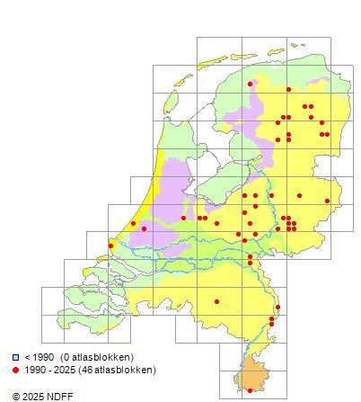 Het aantal atlasblokken (5x5 km) waarin de soort is gemeld binnen een periode van vijf jaar (vanaf 1980) of twintig jaar. Niet gecorrigeerd voor waarnemersinspanning en het aantal doorgegeven waarnemingen kan sterk variëren per periode, dus een trend in verspreiding kan hier niet direct uit worden afgelezen. Het opgegeven jaartal is het eerste jaar van de periode. Bron: gevalideerde waarnemingen uit de NDFF.