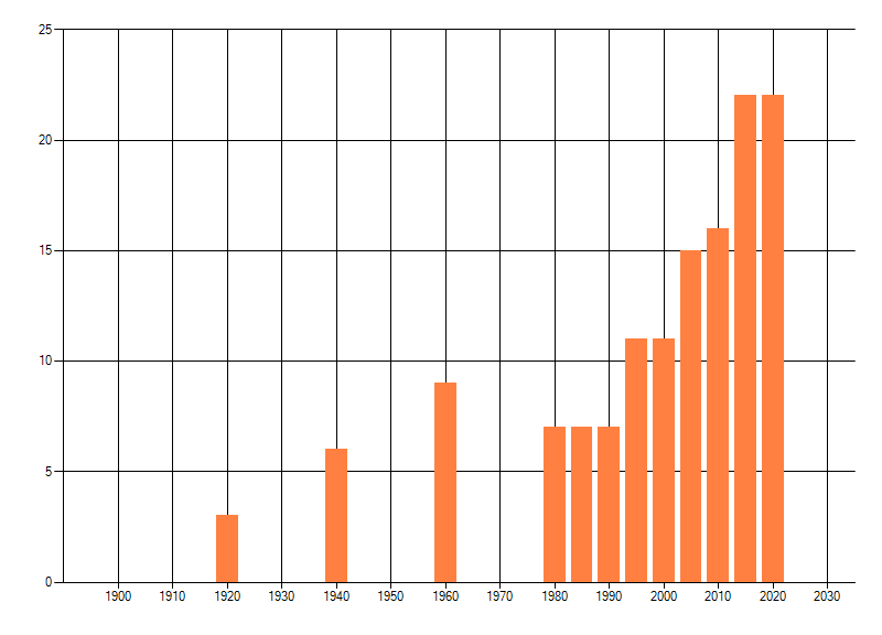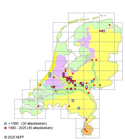 Het aantal atlasblokken (5x5 km) waarin de soort is gemeld binnen een periode van vijf jaar (vanaf 1980) of twintig jaar. Niet gecorrigeerd voor waarnemersinspanning en het aantal doorgegeven waarnemingen kan sterk variëren per periode, dus een trend in verspreiding kan hier niet direct uit worden afgelezen. Het opgegeven jaartal is het eerste jaar van de periode. Bron: gevalideerde waarnemingen uit de NDFF.