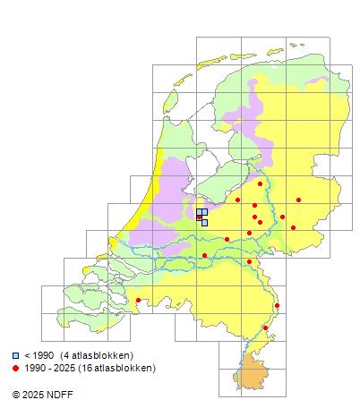 Het aantal atlasblokken (5x5 km) waarin de soort is gemeld binnen een periode van vijf jaar (vanaf 1980) of twintig jaar. Niet gecorrigeerd voor waarnemersinspanning en het aantal doorgegeven waarnemingen kan sterk variëren per periode, dus een trend in verspreiding kan hier niet direct uit worden afgelezen. Het opgegeven jaartal is het eerste jaar van de periode. Bron: gevalideerde waarnemingen uit de NDFF.