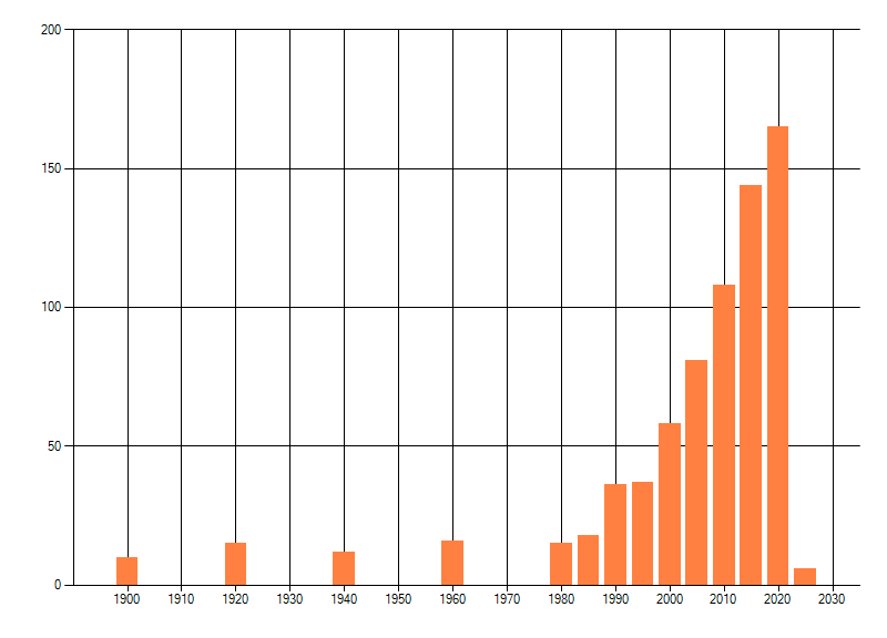 Het aantal atlasblokken (5x5 km) waarin de soort is gemeld binnen een periode van vijf jaar (vanaf 1980) of twintig jaar. Niet gecorrigeerd voor waarnemersinspanning en het aantal doorgegeven waarnemingen kan sterk variëren per periode, dus een trend in verspreiding kan hier niet direct uit worden afgelezen. Het opgegeven jaartal is het eerste jaar van de periode. Bron: gevalideerde waarnemingen uit de NDFF.