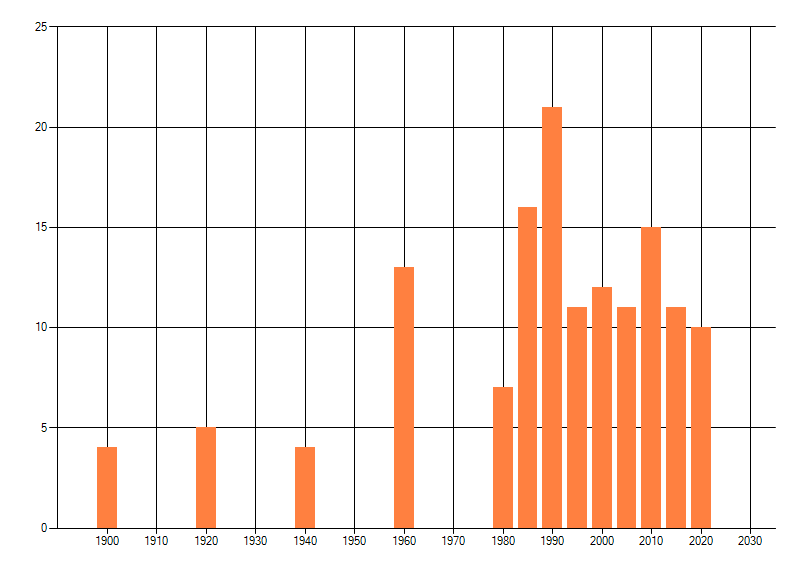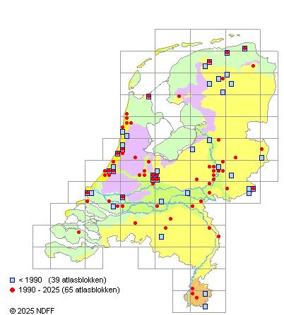 Het aantal atlasblokken (5x5 km) waarin de soort is gemeld binnen een periode van vijf jaar (vanaf 1980) of twintig jaar. Niet gecorrigeerd voor waarnemersinspanning en het aantal doorgegeven waarnemingen kan sterk variëren per periode, dus een trend in verspreiding kan hier niet direct uit worden afgelezen. Het opgegeven jaartal is het eerste jaar van de periode. Bron: gevalideerde waarnemingen uit de NDFF.
