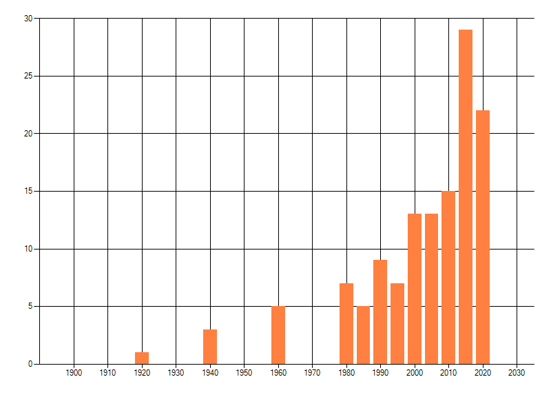 Het aantal atlasblokken (5x5 km) waarin de soort is gemeld binnen een periode van vijf jaar (vanaf 1980) of twintig jaar. Niet gecorrigeerd voor waarnemersinspanning en het aantal doorgegeven waarnemingen kan sterk variëren per periode, dus een trend in verspreiding kan hier niet direct uit worden afgelezen. Het opgegeven jaartal is het eerste jaar van de periode. Bron: gevalideerde waarnemingen uit de NDFF.