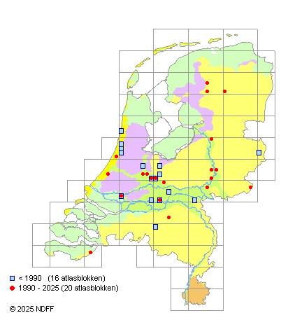 Het aantal atlasblokken (5x5 km) waarin de soort is gemeld binnen een periode van vijf jaar (vanaf 1980) of twintig jaar. Niet gecorrigeerd voor waarnemersinspanning en het aantal doorgegeven waarnemingen kan sterk variëren per periode, dus een trend in verspreiding kan hier niet direct uit worden afgelezen. Het opgegeven jaartal is het eerste jaar van de periode. Bron: gevalideerde waarnemingen uit de NDFF.