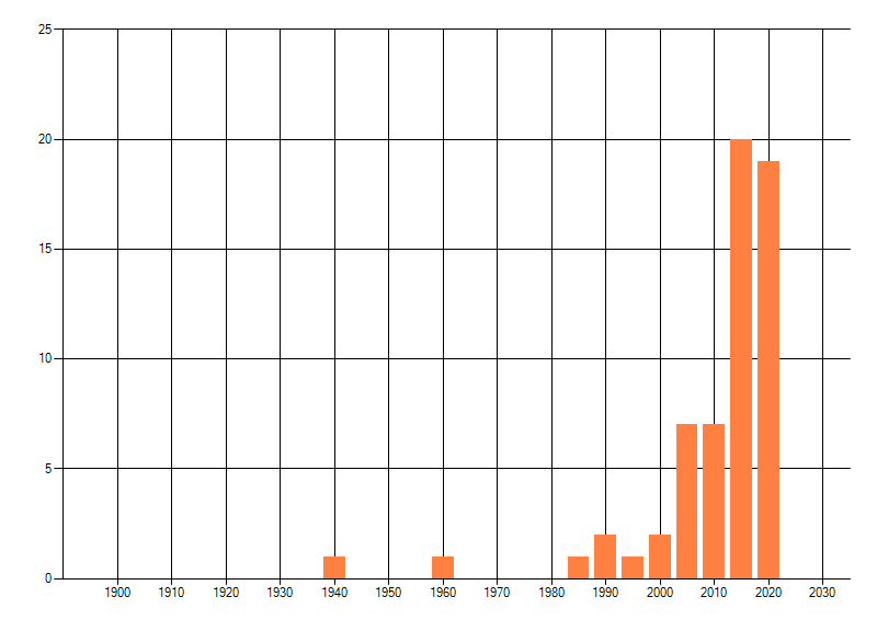 Het aantal atlasblokken (5x5 km) waarin de soort is gemeld binnen een periode van vijf jaar (vanaf 1980) of twintig jaar. Niet gecorrigeerd voor waarnemersinspanning en het aantal doorgegeven waarnemingen kan sterk variëren per periode, dus een trend in verspreiding kan hier niet direct uit worden afgelezen. Het opgegeven jaartal is het eerste jaar van de periode. Bron: gevalideerde waarnemingen uit de NDFF.