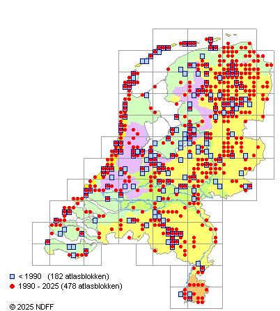 Het aantal atlasblokken (5x5 km) waarin de soort is gemeld binnen een periode van vijf jaar (vanaf 1980) of twintig jaar. Niet gecorrigeerd voor waarnemersinspanning en het aantal doorgegeven waarnemingen kan sterk variëren per periode, dus een trend in verspreiding kan hier niet direct uit worden afgelezen. Het opgegeven jaartal is het eerste jaar van de periode. Bron: gevalideerde waarnemingen uit de NDFF.
