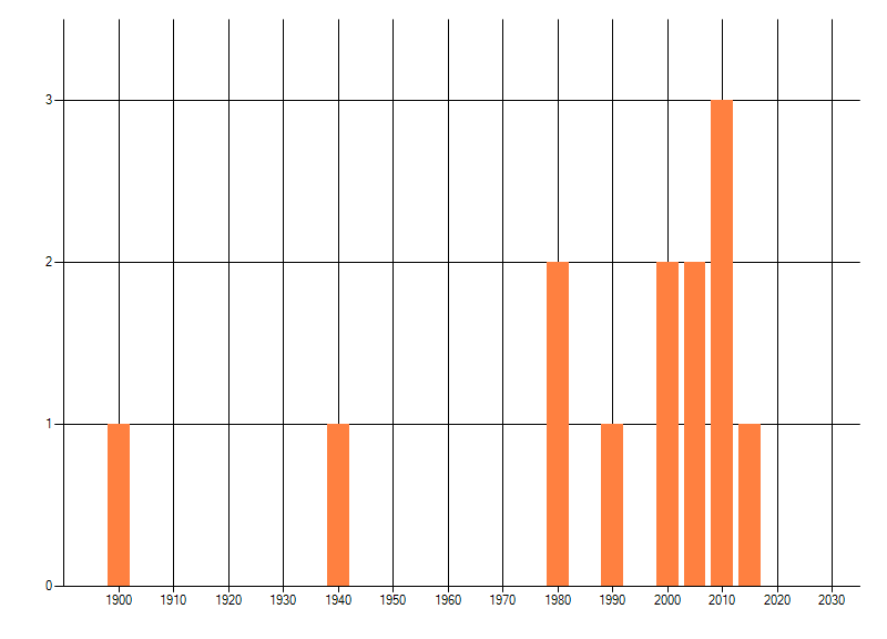 Het aantal atlasblokken (5x5 km) waarin de soort is gemeld binnen een periode van vijf jaar (vanaf 1980) of twintig jaar. Niet gecorrigeerd voor waarnemersinspanning en het aantal doorgegeven waarnemingen kan sterk variëren per periode, dus een trend in verspreiding kan hier niet direct uit worden afgelezen. Het opgegeven jaartal is het eerste jaar van de periode. Bron: gevalideerde waarnemingen uit de NDFF.