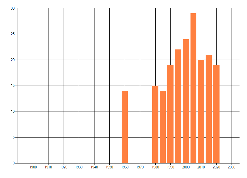 Het aantal atlasblokken (5x5 km) waarin de soort is gemeld binnen een periode van vijf jaar (vanaf 1980) of twintig jaar. Niet gecorrigeerd voor waarnemersinspanning en het aantal doorgegeven waarnemingen kan sterk variëren per periode, dus een trend in verspreiding kan hier niet direct uit worden afgelezen. Het opgegeven jaartal is het eerste jaar van de periode. Bron: gevalideerde waarnemingen uit de NDFF.