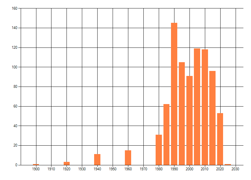 Het aantal atlasblokken (5x5 km) waarin de soort is gemeld binnen een periode van vijf jaar (vanaf 1980) of twintig jaar. Niet gecorrigeerd voor waarnemersinspanning en het aantal doorgegeven waarnemingen kan sterk variëren per periode, dus een trend in verspreiding kan hier niet direct uit worden afgelezen. Het opgegeven jaartal is het eerste jaar van de periode. Bron: gevalideerde waarnemingen uit de NDFF.