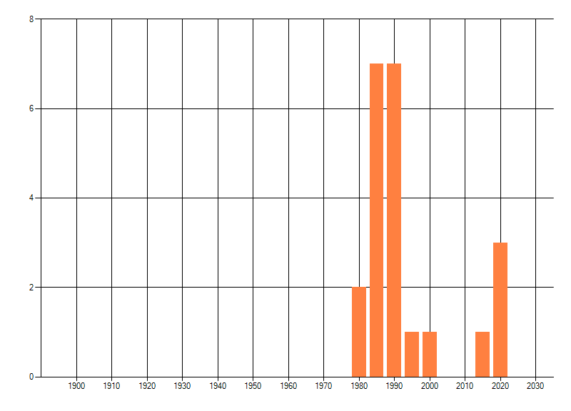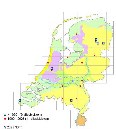 Het aantal atlasblokken (5x5 km) waarin de soort is gemeld binnen een periode van vijf jaar (vanaf 1980) of twintig jaar. Niet gecorrigeerd voor waarnemersinspanning en het aantal doorgegeven waarnemingen kan sterk variëren per periode, dus een trend in verspreiding kan hier niet direct uit worden afgelezen. Het opgegeven jaartal is het eerste jaar van de periode. Bron: gevalideerde waarnemingen uit de NDFF.