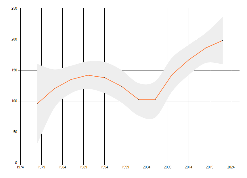 Gemiddelde trend van het aantal kilometerhokken waarin de soort voorkomt, weergegeven als indexcijfer (1975-1978 = 100). De trend is gecorrigeerd voor waarnemersinspanning en geeft de relatieve verandering in het aantal bezette kilometerhokken weer. Voor de berekening worden de data per periode van vier jaar samengenomen. In de grafiek correspondeert ieder punt met het laatste jaar van zo'n periode.