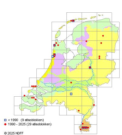 Het aantal atlasblokken (5x5 km) waarin de soort is gemeld binnen een periode van vijf jaar (vanaf 1980) of twintig jaar. Niet gecorrigeerd voor waarnemersinspanning en het aantal doorgegeven waarnemingen kan sterk variëren per periode, dus een trend in verspreiding kan hier niet direct uit worden afgelezen. Het opgegeven jaartal is het eerste jaar van de periode. Bron: gevalideerde waarnemingen uit de NDFF.