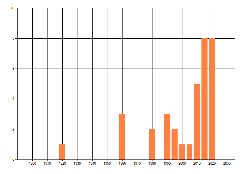Het aantal atlasblokken (5x5 km) waarin de soort is gemeld binnen een periode van vijf jaar (vanaf 1980) of twintig jaar. Niet gecorrigeerd voor waarnemersinspanning en het aantal doorgegeven waarnemingen kan sterk variëren per periode, dus een trend in verspreiding kan hier niet direct uit worden afgelezen. Het opgegeven jaartal is het eerste jaar van de periode. Bron: gevalideerde waarnemingen uit de NDFF.
