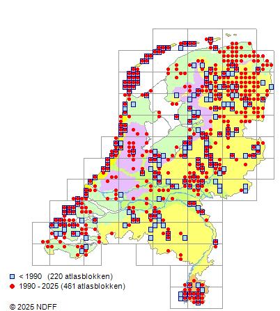 Het aantal atlasblokken (5x5 km) waarin de soort is gemeld binnen een periode van vijf jaar (vanaf 1980) of twintig jaar. Niet gecorrigeerd voor waarnemersinspanning en het aantal doorgegeven waarnemingen kan sterk variëren per periode, dus een trend in verspreiding kan hier niet direct uit worden afgelezen. Het opgegeven jaartal is het eerste jaar van de periode. Bron: gevalideerde waarnemingen uit de NDFF.