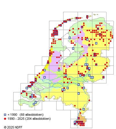 Het aantal atlasblokken (5x5 km) waarin de soort is gemeld binnen een periode van vijf jaar (vanaf 1980) of twintig jaar. Niet gecorrigeerd voor waarnemersinspanning en het aantal doorgegeven waarnemingen kan sterk variëren per periode, dus een trend in verspreiding kan hier niet direct uit worden afgelezen. Het opgegeven jaartal is het eerste jaar van de periode. Bron: gevalideerde waarnemingen uit de NDFF.