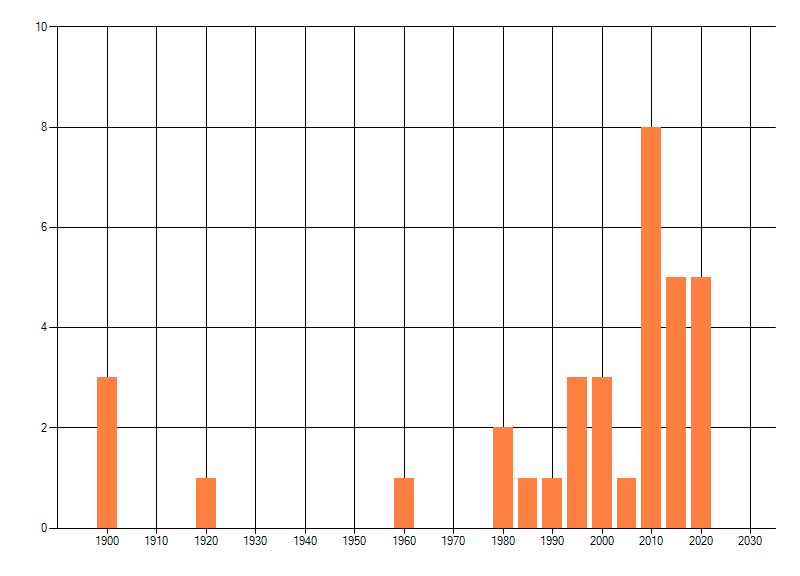 Het aantal atlasblokken (5x5 km) waarin de soort is gemeld binnen een periode van vijf jaar (vanaf 1980) of twintig jaar. Niet gecorrigeerd voor waarnemersinspanning en het aantal doorgegeven waarnemingen kan sterk variëren per periode, dus een trend in verspreiding kan hier niet direct uit worden afgelezen. Het opgegeven jaartal is het eerste jaar van de periode. Bron: gevalideerde waarnemingen uit de NDFF.