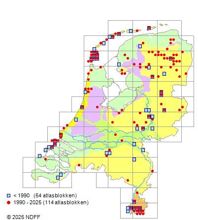 Het aantal atlasblokken (5x5 km) waarin de soort is gemeld binnen een periode van vijf jaar (vanaf 1980) of twintig jaar. Niet gecorrigeerd voor waarnemersinspanning en het aantal doorgegeven waarnemingen kan sterk variëren per periode, dus een trend in verspreiding kan hier niet direct uit worden afgelezen. Het opgegeven jaartal is het eerste jaar van de periode. Bron: gevalideerde waarnemingen uit de NDFF.