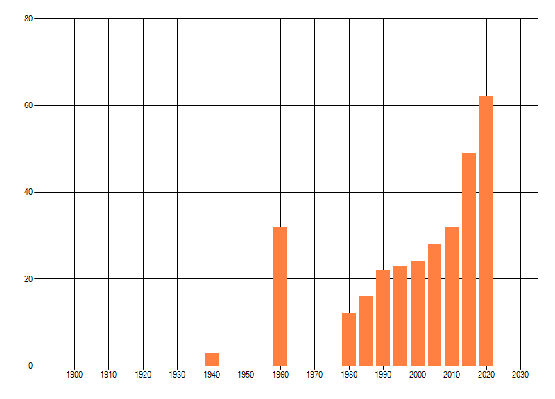Het aantal atlasblokken (5x5 km) waarin de soort is gemeld binnen een periode van vijf jaar (vanaf 1980) of twintig jaar. Niet gecorrigeerd voor waarnemersinspanning en het aantal doorgegeven waarnemingen kan sterk variëren per periode, dus een trend in verspreiding kan hier niet direct uit worden afgelezen. Het opgegeven jaartal is het eerste jaar van de periode. Bron: gevalideerde waarnemingen uit de NDFF.