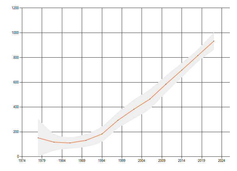 Gemiddelde trend van het aantal kilometerhokken waarin de soort voorkomt, weergegeven als indexcijfer (1975-1978 = 100). De trend is gecorrigeerd voor waarnemersinspanning en geeft de relatieve verandering in het aantal bezette kilometerhokken weer. Voor de berekening worden de data per periode van vier jaar samengenomen. In de grafiek correspondeert ieder punt met het laatste jaar van zo'n periode.