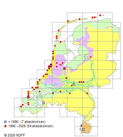 Het aantal atlasblokken (5x5 km) waarin de soort is gemeld binnen een periode van vijf jaar (vanaf 1980) of twintig jaar. Niet gecorrigeerd voor waarnemersinspanning en het aantal doorgegeven waarnemingen kan sterk variëren per periode, dus een trend in verspreiding kan hier niet direct uit worden afgelezen. Het opgegeven jaartal is het eerste jaar van de periode. Bron: gevalideerde waarnemingen uit de NDFF.