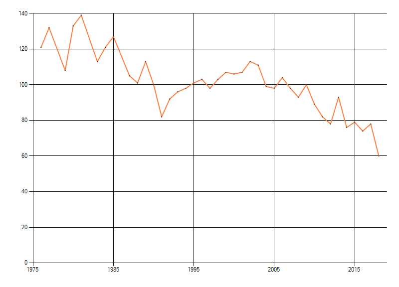 Gemiddelde trend van het aantal kilometerhokken waarin de soort voorkomt, weergegeven als indexcijfer (1975-1978 = 100). De trend is gecorrigeerd voor waarnemersinspanning en geeft de relatieve verandering in het aantal bezette kilometerhokken weer. Voor de berekening worden de data per periode van vier jaar samengenomen. In de grafiek correspondeert ieder punt met het laatste jaar van zo'n periode.