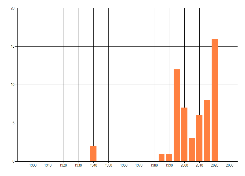 Het aantal atlasblokken (5x5 km) waarin de soort is gemeld binnen een periode van vijf jaar (vanaf 1980) of twintig jaar. Niet gecorrigeerd voor waarnemersinspanning en het aantal doorgegeven waarnemingen kan sterk variëren per periode, dus een trend in verspreiding kan hier niet direct uit worden afgelezen. Het opgegeven jaartal is het eerste jaar van de periode. Bron: gevalideerde waarnemingen uit de NDFF.