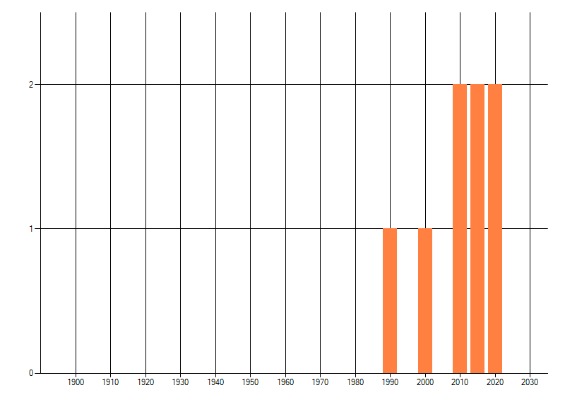 Het aantal atlasblokken (5x5 km) waarin de soort is gemeld binnen een periode van vijf jaar (vanaf 1980) of twintig jaar. Niet gecorrigeerd voor waarnemersinspanning en het aantal doorgegeven waarnemingen kan sterk variëren per periode, dus een trend in verspreiding kan hier niet direct uit worden afgelezen. Het opgegeven jaartal is het eerste jaar van de periode. Bron: gevalideerde waarnemingen uit de NDFF.