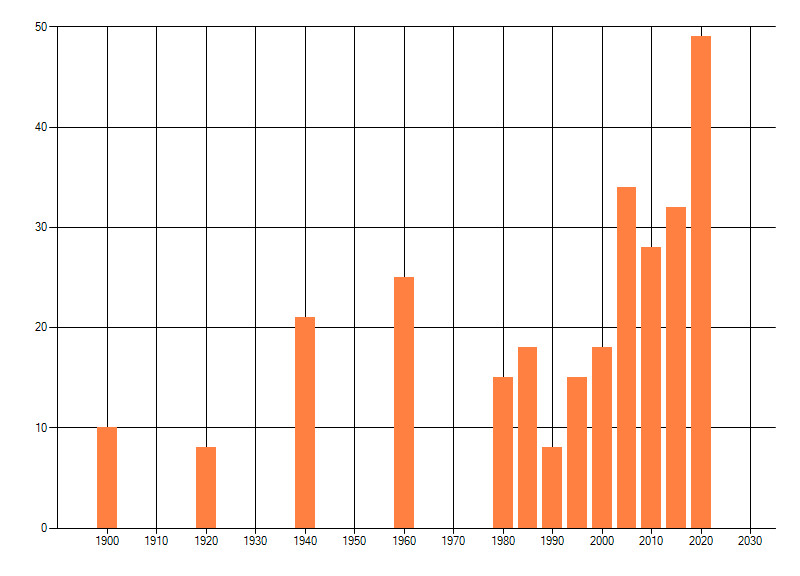 Het aantal atlasblokken (5x5 km) waarin de soort is gemeld binnen een periode van vijf jaar (vanaf 1980) of twintig jaar. Niet gecorrigeerd voor waarnemersinspanning en het aantal doorgegeven waarnemingen kan sterk variëren per periode, dus een trend in verspreiding kan hier niet direct uit worden afgelezen. Het opgegeven jaartal is het eerste jaar van de periode. Bron: gevalideerde waarnemingen uit de NDFF.