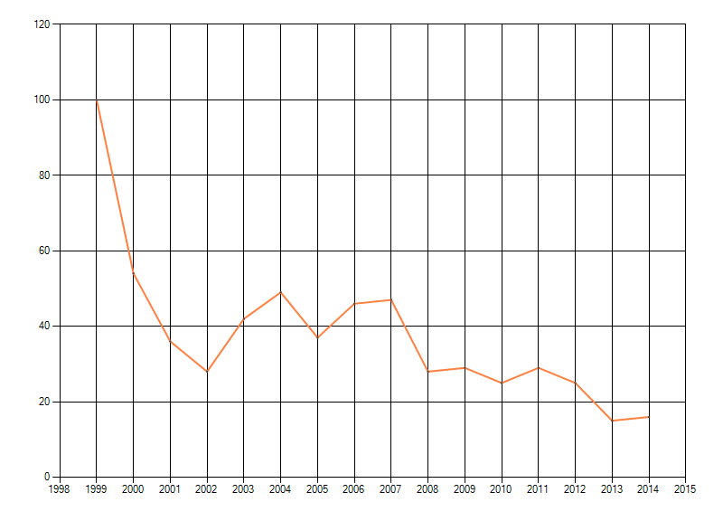 Trend in het geschatte aantal individuen van paddenstoelen in bossen op de hoge zandgronden, weergegeven als indexcijfer (eerste jaar = 100). Bron: