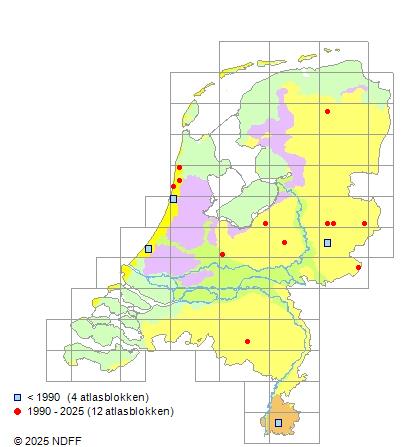 Het aantal atlasblokken (5x5 km) waarin de soort is gemeld binnen een periode van vijf jaar (vanaf 1980) of twintig jaar. Niet gecorrigeerd voor waarnemersinspanning en het aantal doorgegeven waarnemingen kan sterk variëren per periode, dus een trend in verspreiding kan hier niet direct uit worden afgelezen. Het opgegeven jaartal is het eerste jaar van de periode. Bron: gevalideerde waarnemingen uit de NDFF.