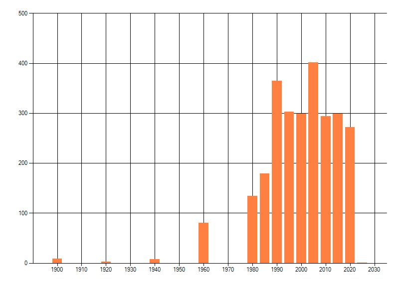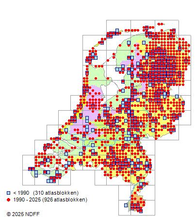 Het aantal atlasblokken (5x5 km) waarin de soort is gemeld binnen een periode van vijf jaar (vanaf 1980) of twintig jaar. Niet gecorrigeerd voor waarnemersinspanning en het aantal doorgegeven waarnemingen kan sterk variëren per periode, dus een trend in verspreiding kan hier niet direct uit worden afgelezen. Het opgegeven jaartal is het eerste jaar van de periode. Bron: gevalideerde waarnemingen uit de NDFF.