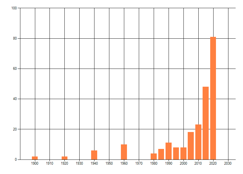 Het aantal atlasblokken (5x5 km) waarin de soort is gemeld binnen een periode van vijf jaar (vanaf 1980) of twintig jaar. Niet gecorrigeerd voor waarnemersinspanning en het aantal doorgegeven waarnemingen kan sterk variëren per periode, dus een trend in verspreiding kan hier niet direct uit worden afgelezen. Het opgegeven jaartal is het eerste jaar van de periode. Bron: gevalideerde waarnemingen uit de NDFF.