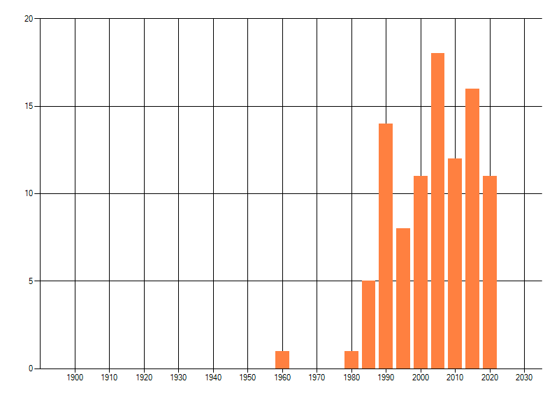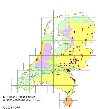 Het aantal atlasblokken (5x5 km) waarin de soort is gemeld binnen een periode van vijf jaar (vanaf 1980) of twintig jaar. Niet gecorrigeerd voor waarnemersinspanning en het aantal doorgegeven waarnemingen kan sterk variëren per periode, dus een trend in verspreiding kan hier niet direct uit worden afgelezen. Het opgegeven jaartal is het eerste jaar van de periode. Bron: gevalideerde waarnemingen uit de NDFF.