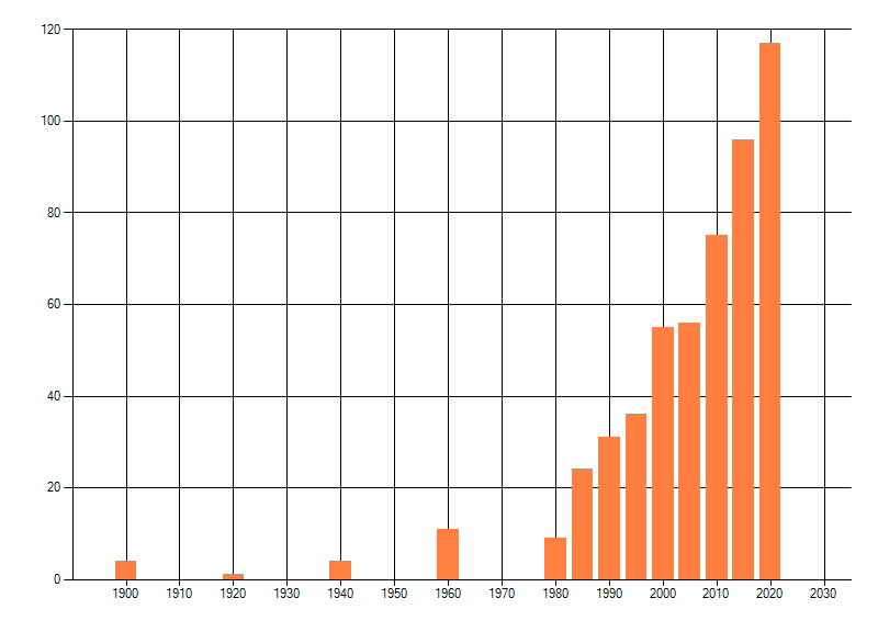 Het aantal atlasblokken (5x5 km) waarin de soort is gemeld binnen een periode van vijf jaar (vanaf 1980) of twintig jaar. Niet gecorrigeerd voor waarnemersinspanning en het aantal doorgegeven waarnemingen kan sterk variëren per periode, dus een trend in verspreiding kan hier niet direct uit worden afgelezen. Het opgegeven jaartal is het eerste jaar van de periode. Bron: gevalideerde waarnemingen uit de NDFF.