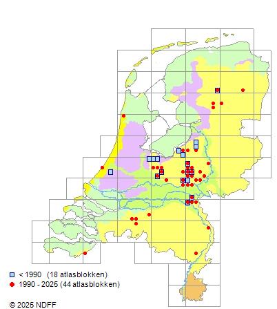 Het aantal atlasblokken (5x5 km) waarin de soort is gemeld binnen een periode van vijf jaar (vanaf 1980) of twintig jaar. Niet gecorrigeerd voor waarnemersinspanning en het aantal doorgegeven waarnemingen kan sterk variëren per periode, dus een trend in verspreiding kan hier niet direct uit worden afgelezen. Het opgegeven jaartal is het eerste jaar van de periode. Bron: gevalideerde waarnemingen uit de NDFF.