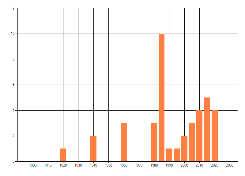 Het aantal atlasblokken (5x5 km) waarin de soort is gemeld binnen een periode van vijf jaar (vanaf 1980) of twintig jaar. Niet gecorrigeerd voor waarnemersinspanning en het aantal doorgegeven waarnemingen kan sterk variëren per periode, dus een trend in verspreiding kan hier niet direct uit worden afgelezen. Het opgegeven jaartal is het eerste jaar van de periode. Bron: gevalideerde waarnemingen uit de NDFF.